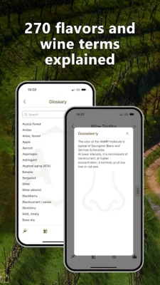 • Access expert knowledge with 270 aromas, flavors and wine terms.