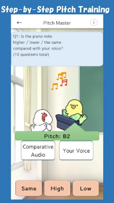 Step‑by‑step pitch training: first learn to recognize and control your own pitch, then other people’s voices, and finally piano notes—designed so even self‑described “tone‑deaf” users can build pitch sense.